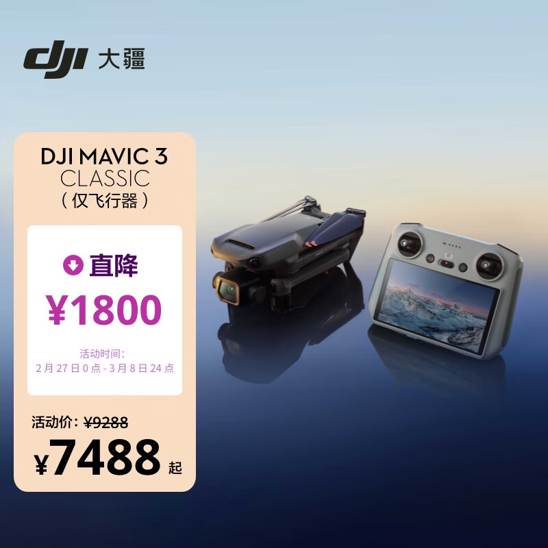 大疆 DJI Mavic 3 Classic (仅飞行器)御3经典版航拍无人机 哈苏相机 高清影像拍摄 智能返航价格:7488.00元!