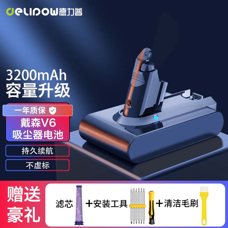 德力普(Delipow)适用戴森Dyson电池V6吸尘器充电锂电池配件 3200毫安大容量DC59/62/74/SV03/04/05/06等电池替代品价格:164.50元!