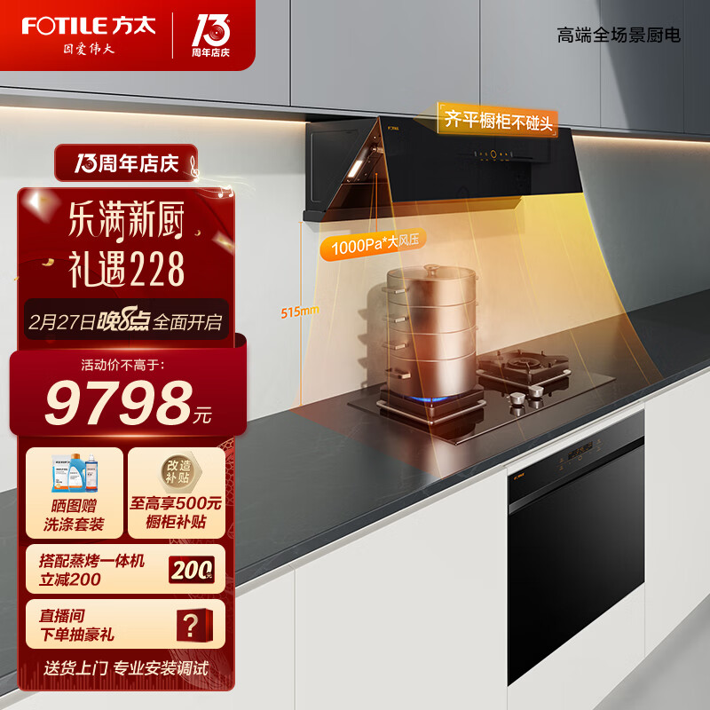 方太烟灶洗三件套 23风量智能巡航直流变频烟机 5.2kW猛火灶 15套嵌入式洗碗机JCD10TA+02-TH27B+VJ06价格:9798.00元!