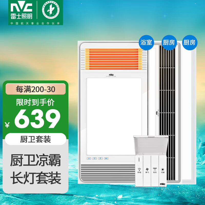 雷士(NVC)风暖浴霸排气扇照明一体卫生间集成吊顶浴室取暖器厨卫套餐A价格:729.00元!
