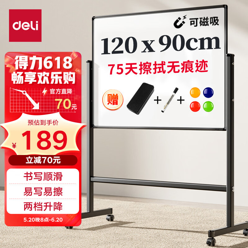得力白板写字板120*90cm H型碳钢支架式磁吸白板书写画画可移动可升降办公会议黑板家庭辅导培训33715价格:259.00元!