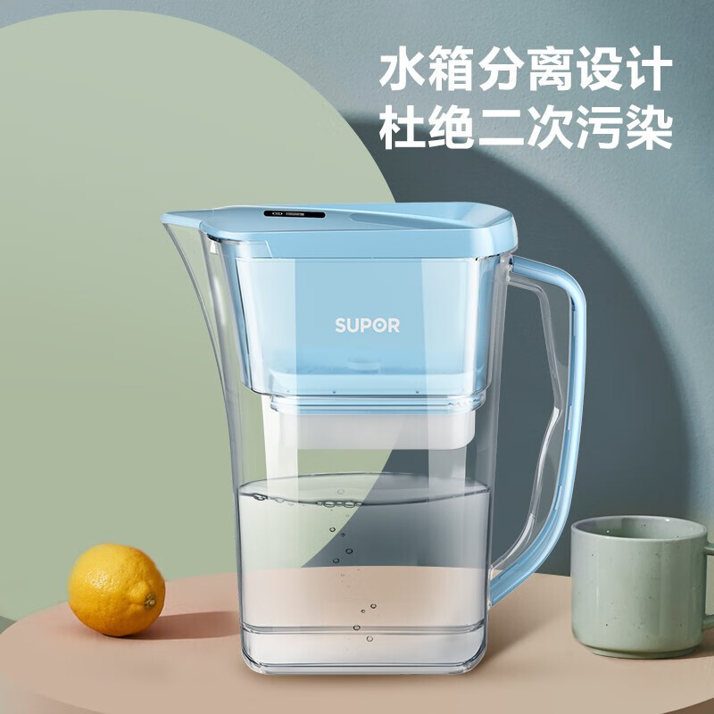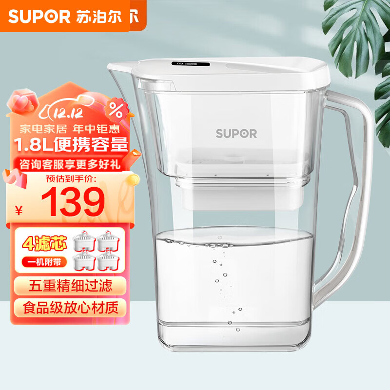 苏泊尔(SUPOR)过滤净水器 家用滤水壶 自来水过滤器净水壶 J-UF01(白色)一壶四芯价格:139.00元!