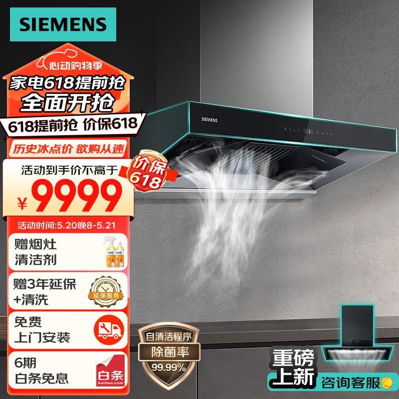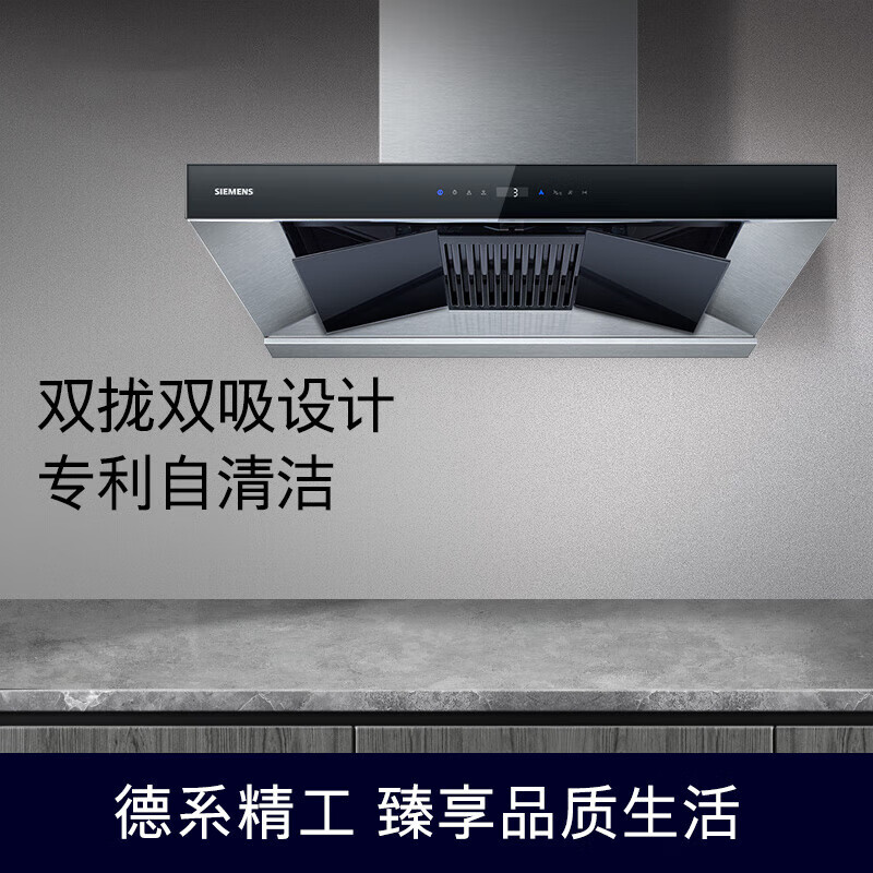 西门子(SIEMENS)欧吸式家用抽油烟机 智能展翼油烟机 智能双拢双吸自清洁 大吸力26m3/min风量 LC88FC958W价格:9999.00元!
