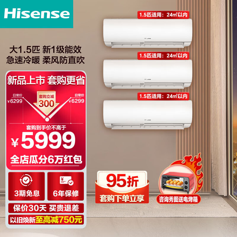 海信(Hisense)1.5匹 新一级变频 空调挂机 速冷热 冷暖智能 低音自清洁卧室壁挂式 3台套装 KFR-35GW/E290-X1价格:5999.00元!