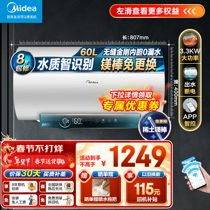美的(Midea)储水式电热水器一级能效省电出水断电终身免换镁棒3300W速热加长防电墙多段变频加热JA5系列 60L 3300W 型号F6032-JA5 一级能效价格:1499.00元!