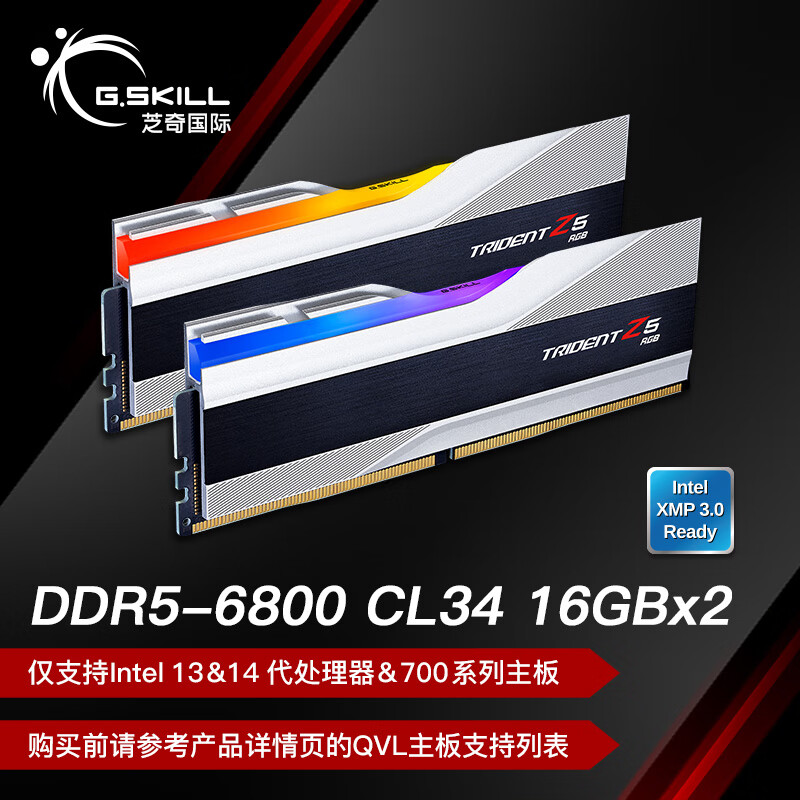 芝奇(G.SKILL)32GB(16Gx2) DDR5 6800 台式机内存条-幻锋戟RGB灯条(科技银)/Intel XMP/C34价格:978.00元!