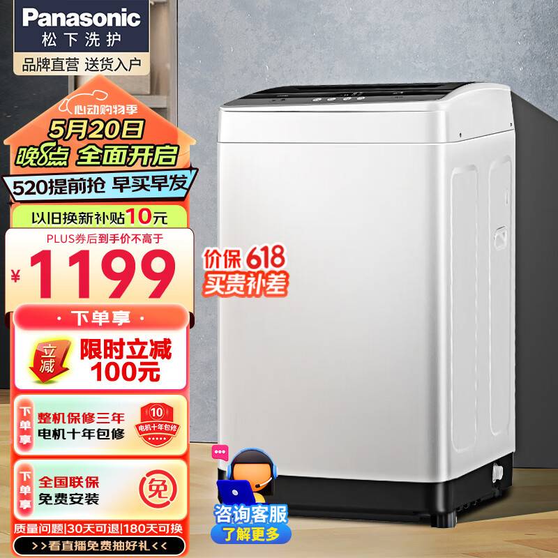 松下(Panasonic)10公斤家用大容量波轮洗衣机全自动 租房洗衣机 节能省电省水 简单操作 大水量活水漂洗 筒自洁 XQB100-KNA07价格:1399.00元!
