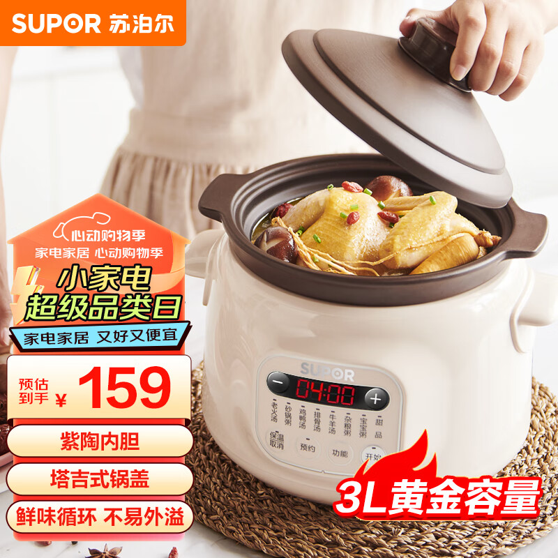 苏泊尔(SUPOR)电炖锅 电炖盅 电砂锅 煲汤锅炖汤锅 紫砂锅 燕窝炖盅 煮粥神器 婴儿辅食锅 电煮锅3升 DG30YC816价格:159.00元!