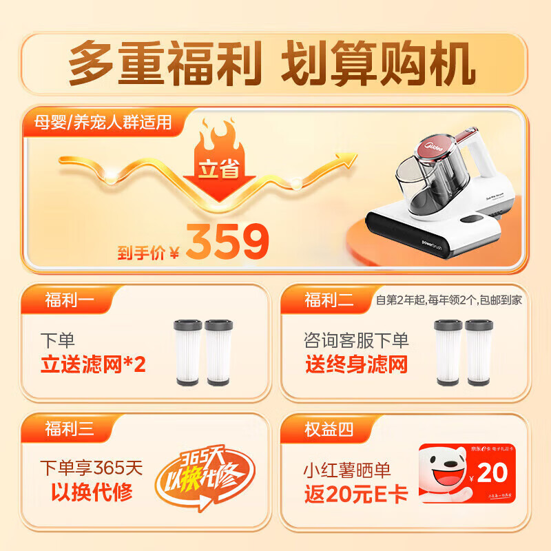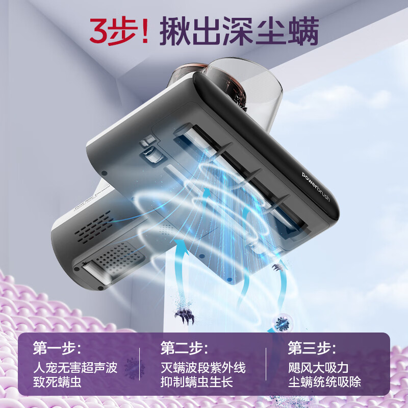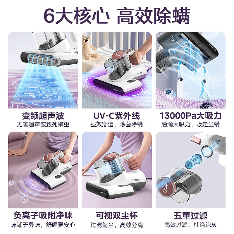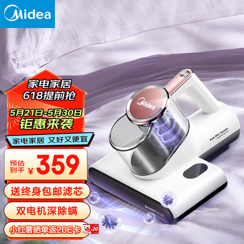 美的(Midea)除螨仪大吸力双杯尘螨分离 家用床上吸尘器 紫外线杀菌除味除螨机 BC6小海豚【520礼物】价格:359.00元!