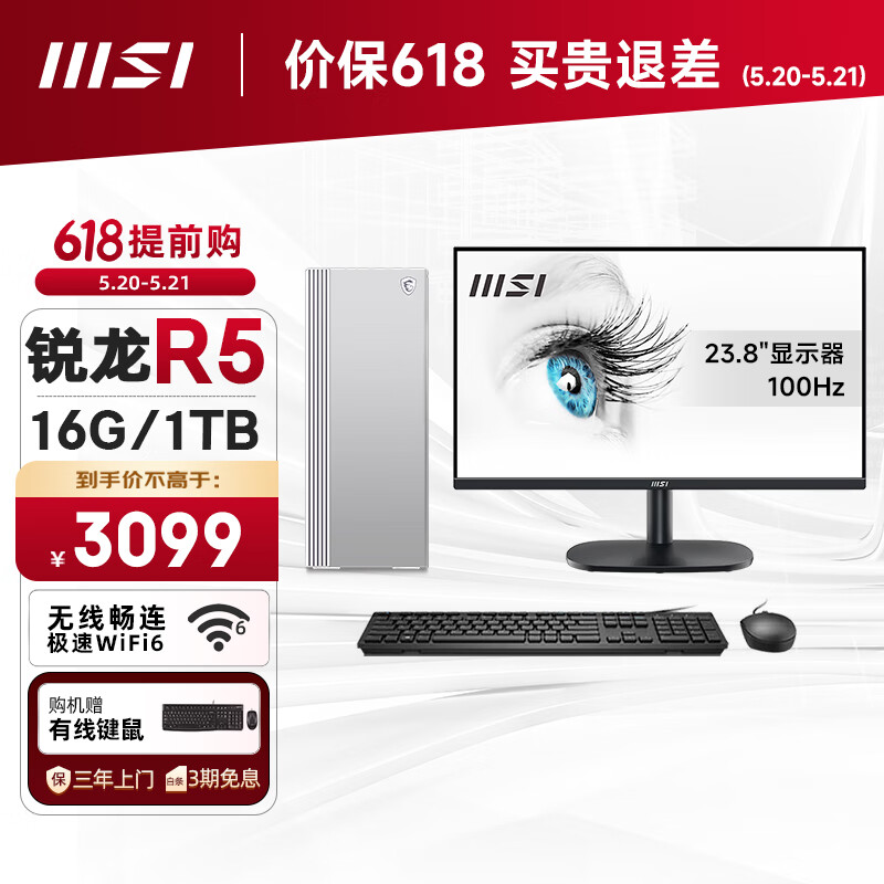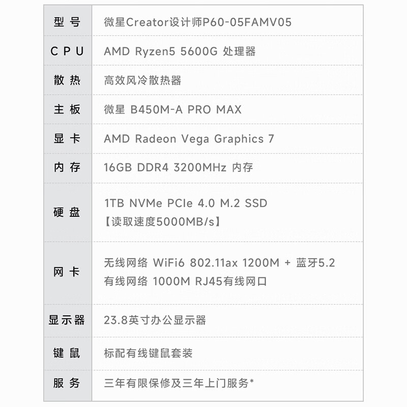 微星 设计师P60办公台式电脑(AMD锐龙R5-5600G 16G 1TSSD?商务键鼠WiFi6)23.8英寸全套整机商用主机价格:3099.00元!