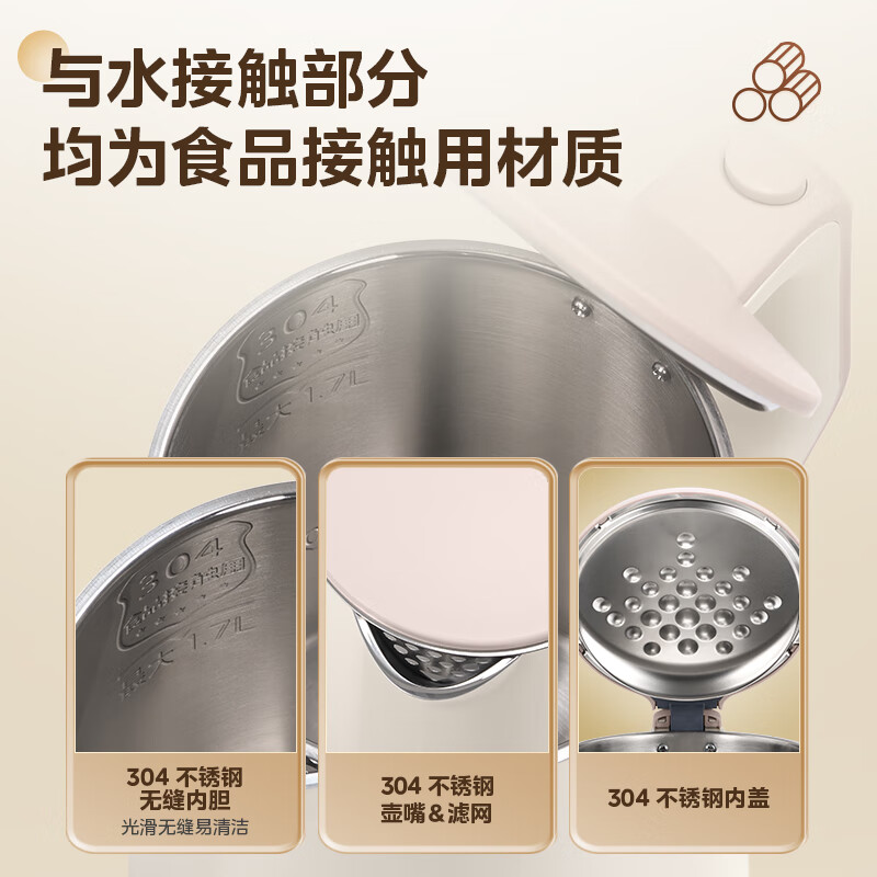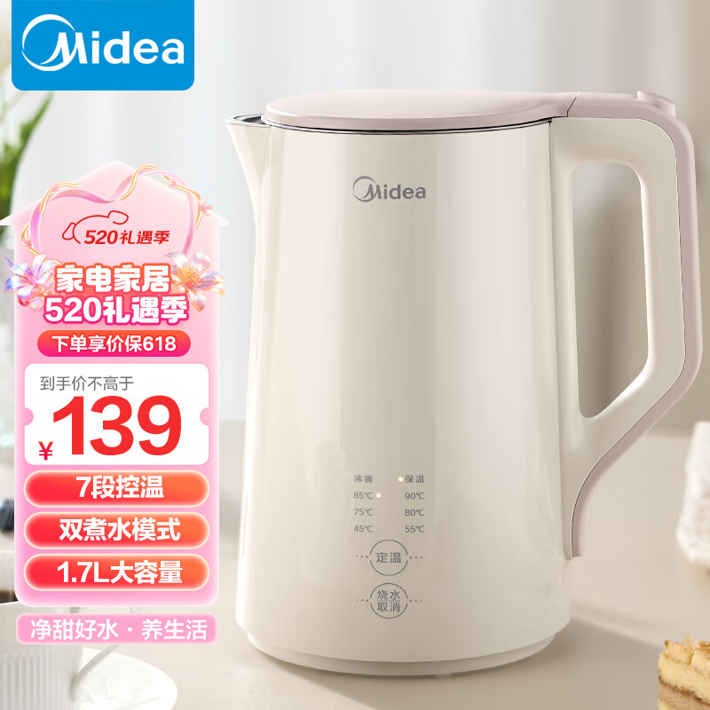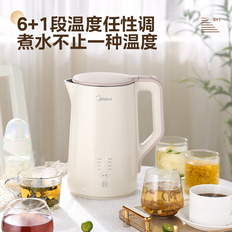 美的(Midea)电热水壶烧水壶1.7L大容量多段控温保温恒温家用开水壶无缝内胆智能自动断电热水壶SHE1732价格:129.00元!
