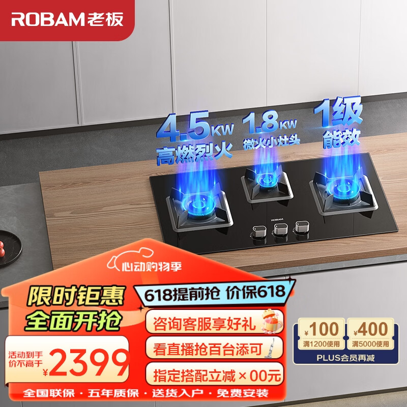 老板(Robam)燃气灶天然气灶 嵌入式猛火灶家用钢化玻璃面板灶具灶台4.5kW可拆卸易清洁三眼灶JZT-39B1A价格:2599.00元!