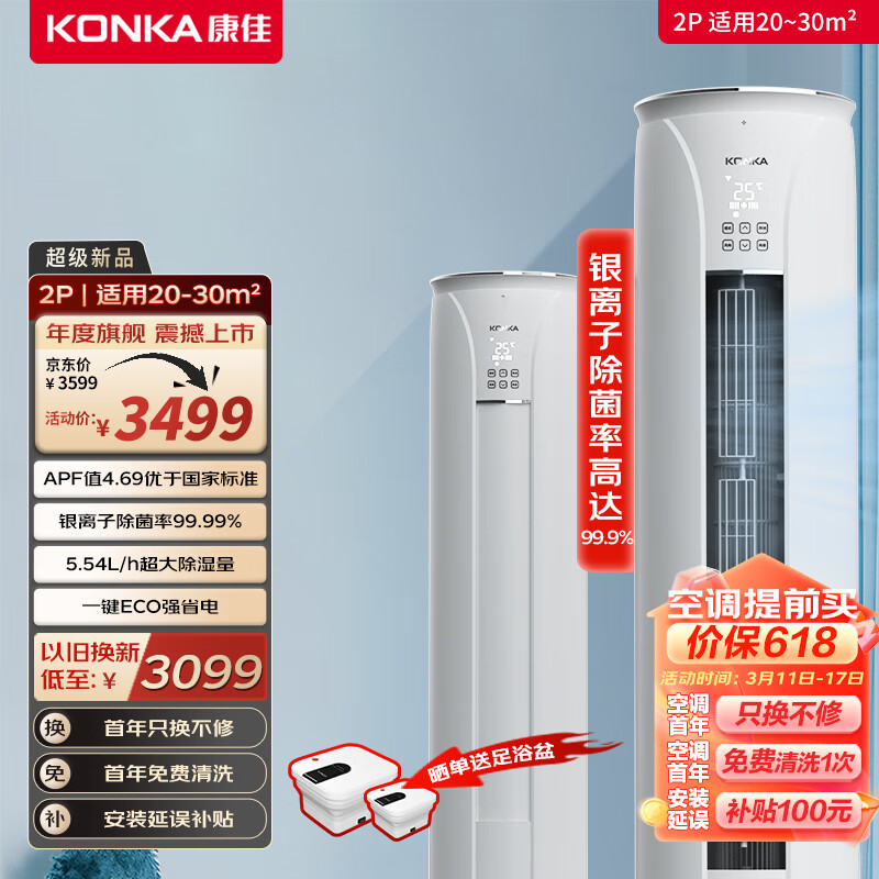 康佳(KONKA)空调2匹 新一级能效 变频冷暖 银离子除菌 强力除湿 空调柜机 空调立式 KFR-51LW/TVC1 以旧换新价格:3499.00元!