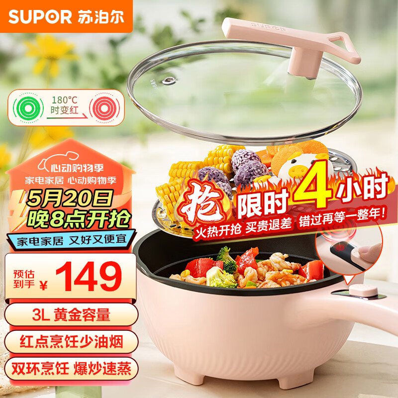 苏泊尔(SUPOR)电炒锅 电煮锅 电蒸锅 电热锅 电火锅 家用多功能一体 蒸煮炒菜不粘 3L多用途锅CJ24A822 配蒸片价格:149.00元!