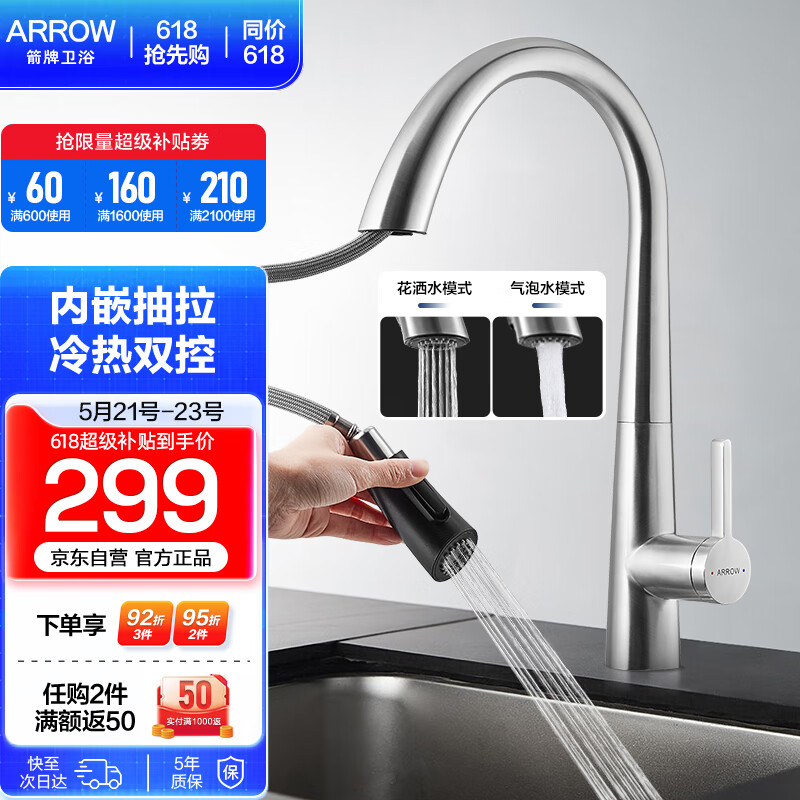 箭牌(ARROW) 厨房304不锈钢厨房龙头冷热抽拉式龙头洗碗盆洗菜盆 天鹅颈抽拉龙头45109价格:299.00元!