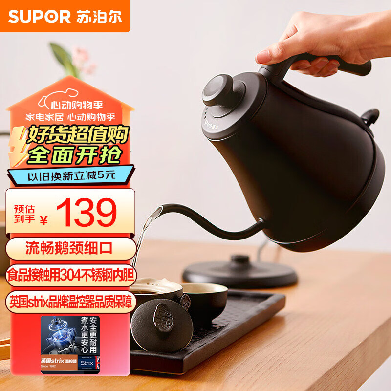 苏泊尔(SUPOR)电水壶热水壶 0.8L手冲咖啡壶长嘴细口茶艺壶 烧水壶 304不锈钢 泡茶壶 SW-08C01价格:139.00元!
