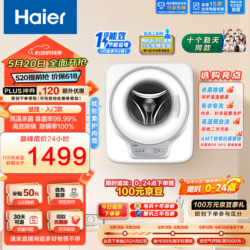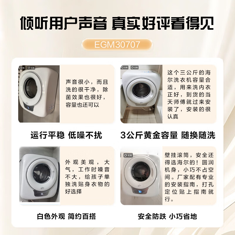 海尔(Haier)壁挂洗衣机3KG 洗衣机小型 内衣裤洗衣机全自动 婴儿儿童挂壁式 除菌 一级能效 以旧换新EGM30707价格:1599.00元!