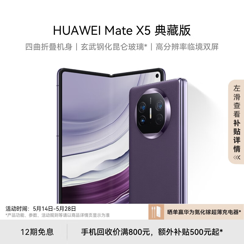 华为(HUAWEI) Mate X5 典藏版 折叠屏手机 16GB+512GB 幻影紫价格:15999.00元!