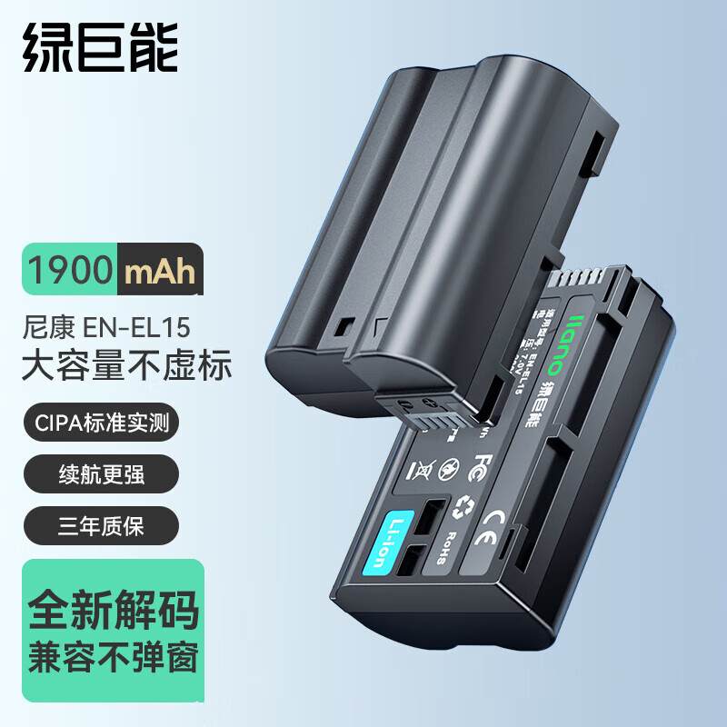 绿巨能(llano)尼康电池 EN-EL15数码电池 适用D7100电池D7500 D750 D810 D850等相机电池价格:119.00元!