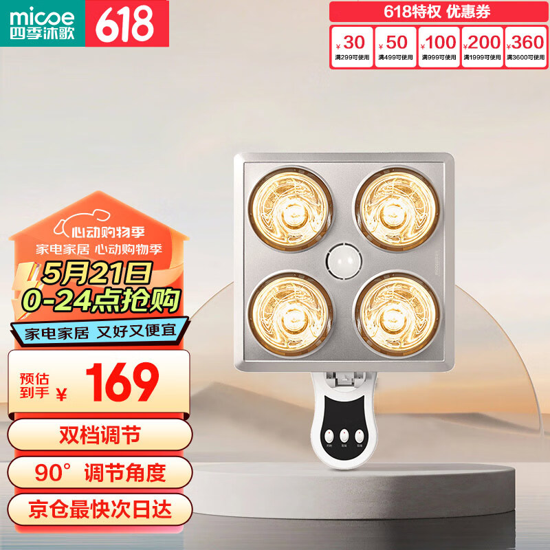 四季沐歌(MICOE)壁挂式四灯暖浴霸 即开即热取暖照明速热 双档取暖调节角度价格:169.00元!