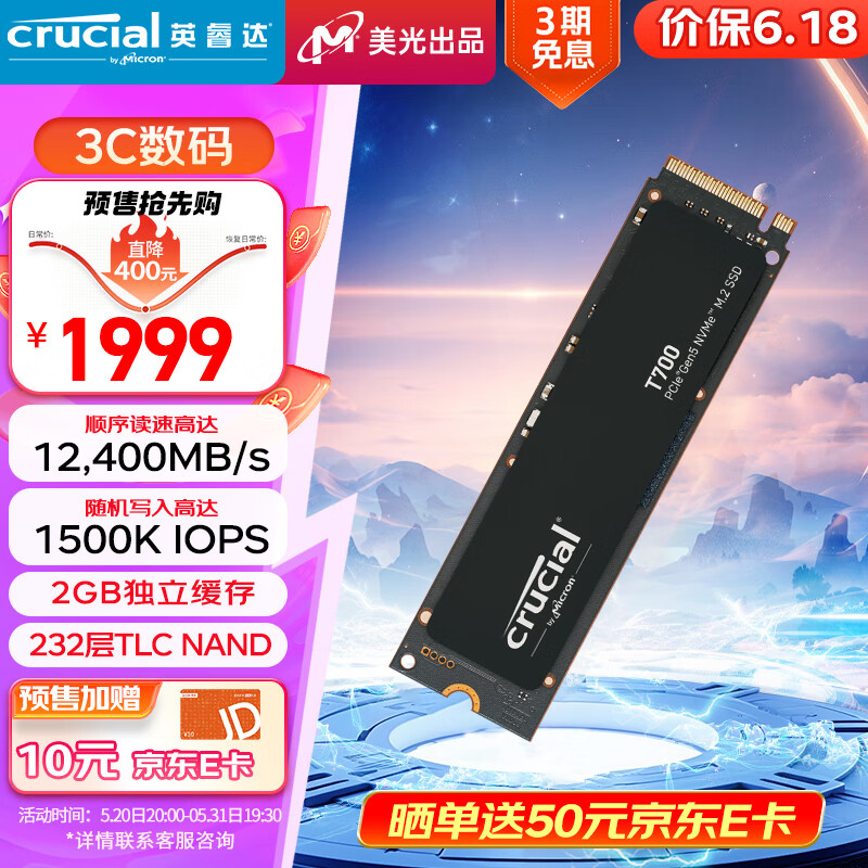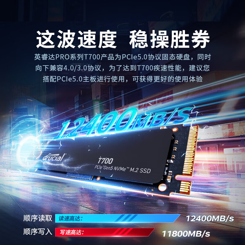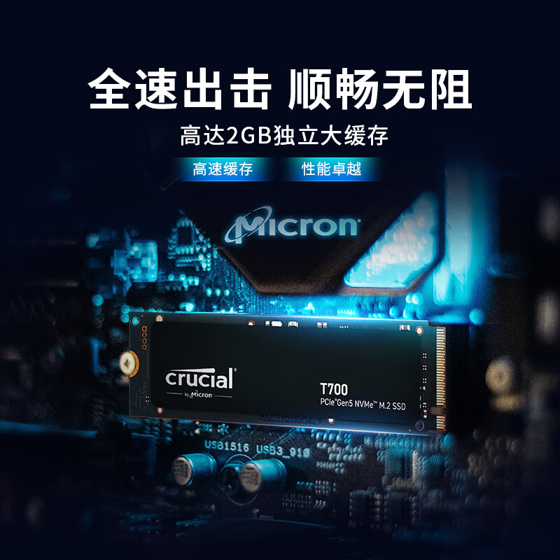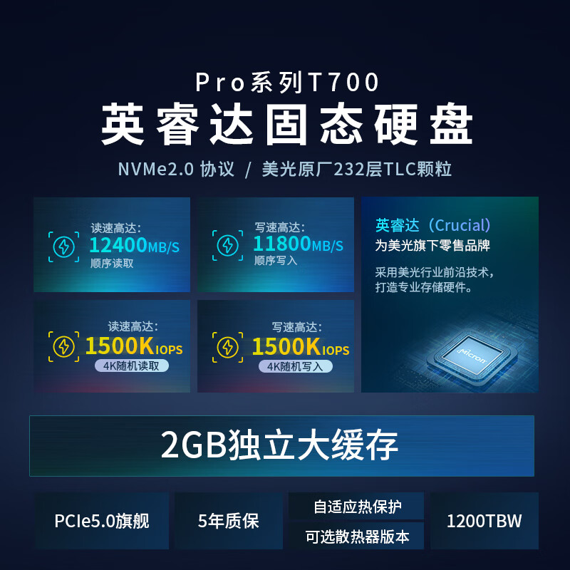 Crucial英睿达 美光 2TB SSD固态硬盘 M.2接口(NVMe协议)四通道PCIe5.0 读速12400MB/s Pro系列T700价格:1999.00元!