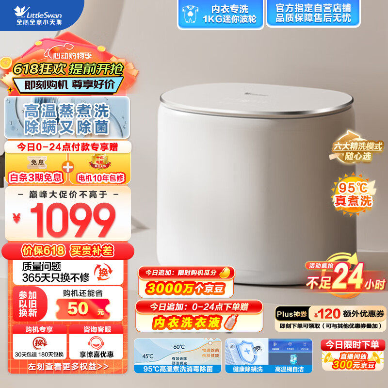 小天鹅(LittleSwan)1KG迷你洗衣机全自动 内衣裤洗衣机 小型迷你婴儿洗衣机 健康除螨洗 TNB10V0WE 健康桶自洁价格:1099.00元!