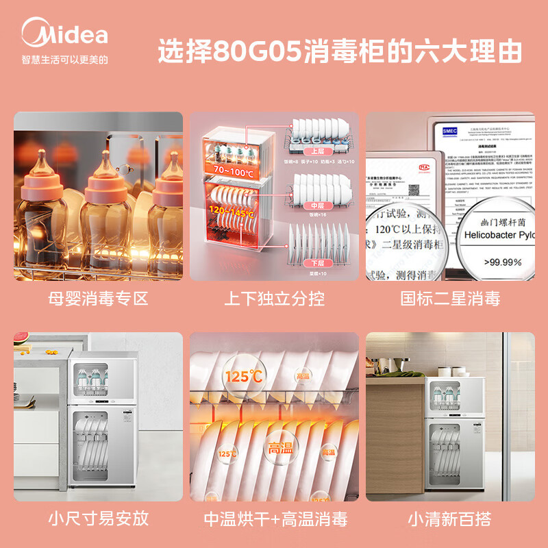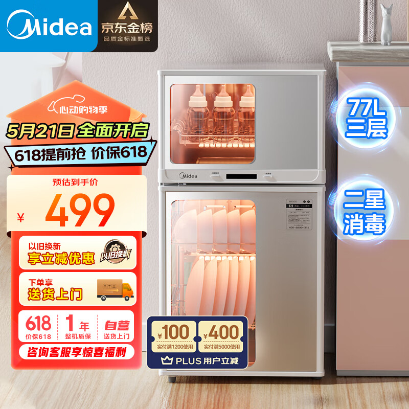 美的(Midea)消毒柜家用 厨房餐具碗柜碗筷茶杯消烘一体机 小型立式 婴儿奶瓶 77L三层 高温二 80G05价格:499.00元!