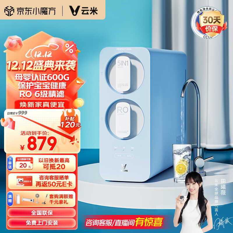 云米(VIOMI)净水器600G小蓝调母婴净水器家用直饮前置厨房自来水ro反渗透过滤器价格:879.00元!