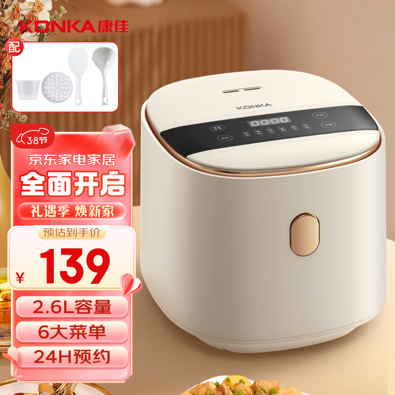 康佳(KONKA)电饭煲 小电饭锅 家用2.6L大容量2-5人煮饭煮粥锅辅食锅智能预约 KDFB-2601E-W价格:99.90元!