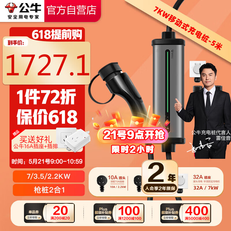 公牛(BULL)便携式充电桩充电枪随车充适配于小米su7汽车比亚迪极氪等7KW/3.5KW枪桩2合1固定便携两用 5M价格:2399.00元!