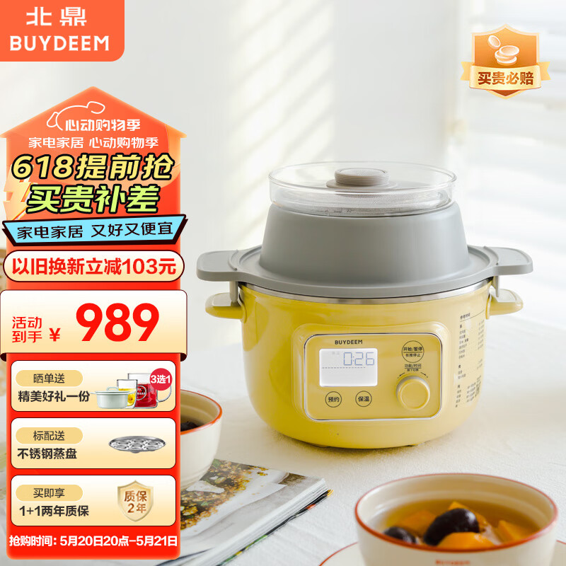 北鼎(Buydeem)家用迷你电煮锅电火锅多功能全自动预约多用途锅 【小鹅黄G37 含炖盅+陶瓷蒸蛋盘】价格:989.00元!