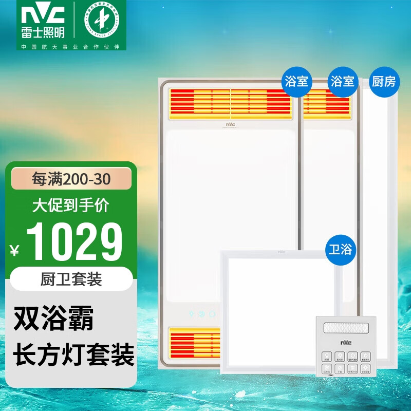 雷士(NVC)双风口取暖/换气浴霸排气扇照明一体暖风机浴室取暖器+面板灯套餐价格:1309.00元!