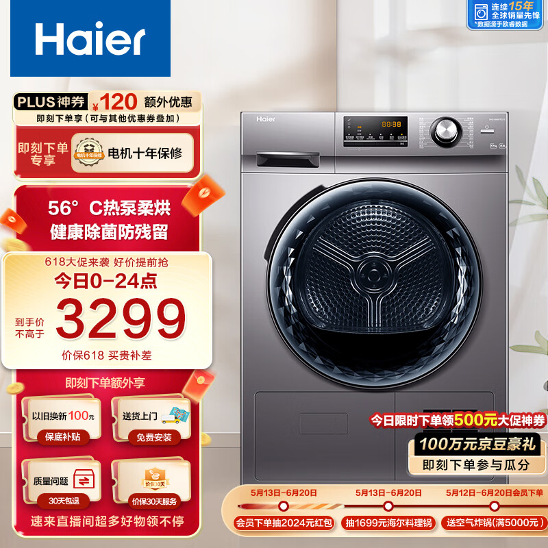 海尔(Haier)烘干机家用 10公斤热泵干衣机 烘衣机 速烘节能 除菌除潮除螨 EHG100MATE21S 以旧换新价格:3799.00元!
