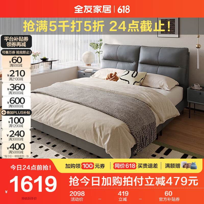 全友家居 头层牛皮现代简约真皮艺软包床1.8x2米主卧室双人大床116019价格:2098.75元!