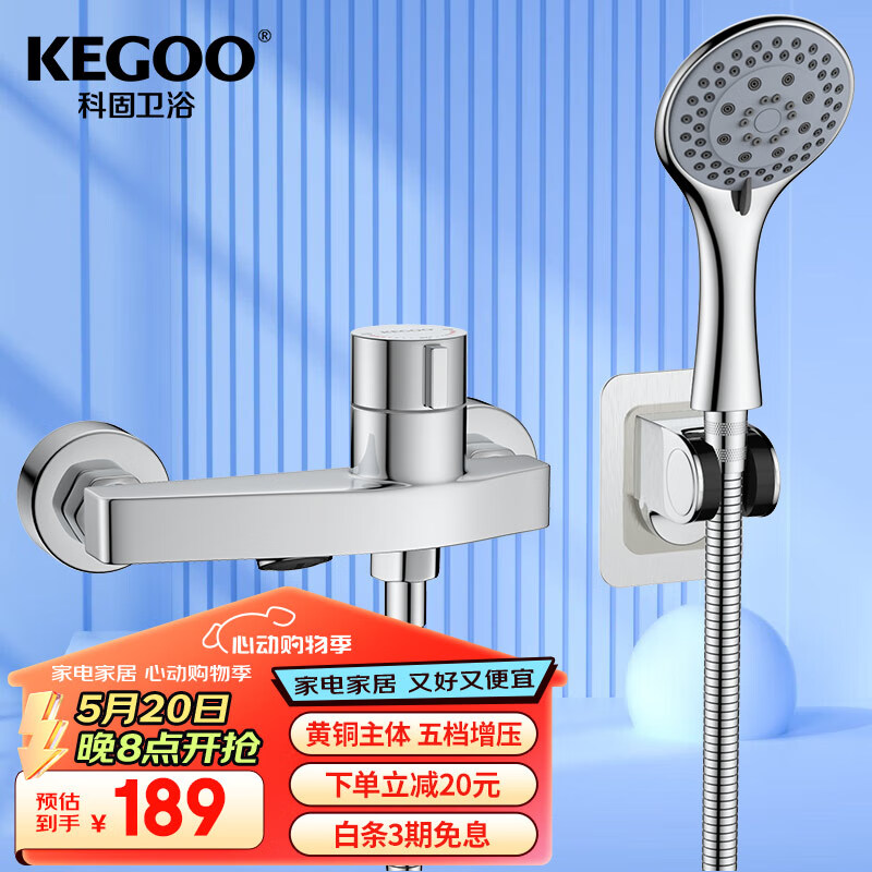 科固(KEGOO)淋浴水龙头手持喷头软管三件套 浴室冷热混水阀简易花洒套装K3008价格:209.00元!