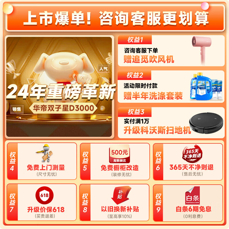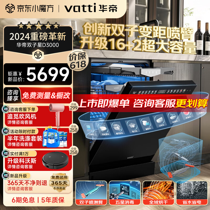 华帝(VATTI)16+2套洗碗机嵌入式 1级覆盖全域洗 105℃热风独立烘干 家用变频洗消 一级水效 双子星系列D3000价格:6299.00元!