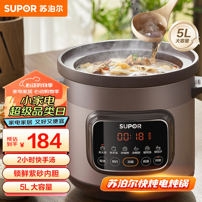 苏泊尔(SUPOR)快炖电炖锅 电砂锅 电炖盅 炖汤盅煲汤锅 紫砂锅 燕窝炖盅 煮粥神器 熬粥锅 5L容量 DG50YC872价格:184.00元!
