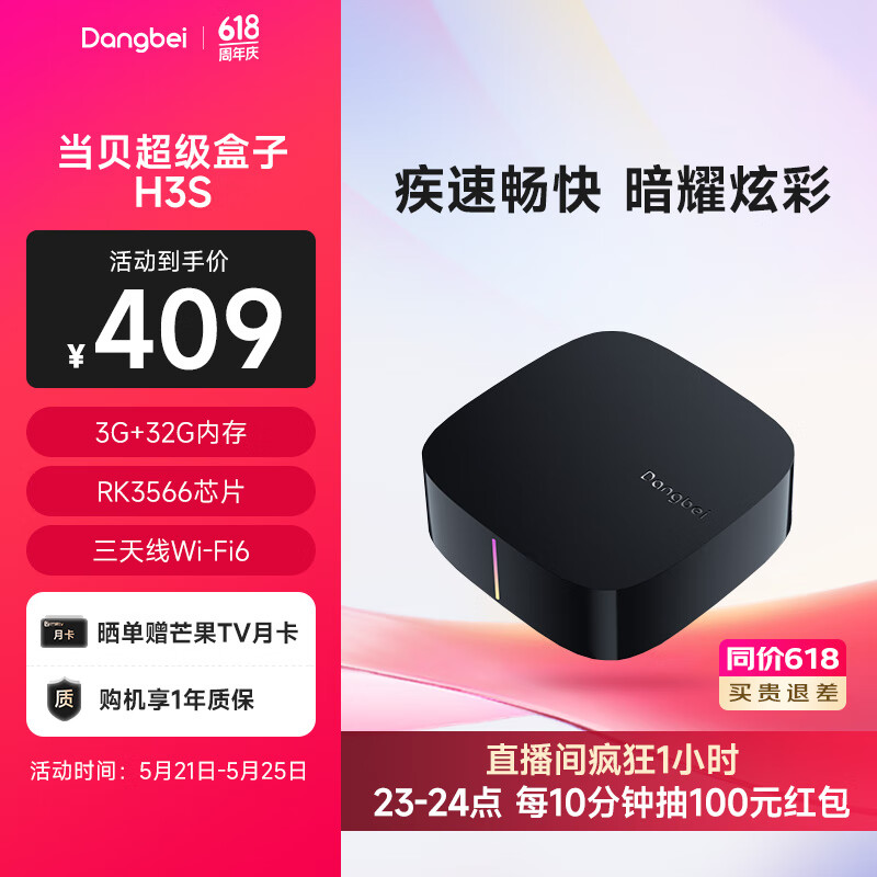 当贝电视盒子 H3S 智能网络电视机顶盒 3G+32G内存 RK3566芯片 8K强悍解码 WiFi6 幻彩呼吸灯价格:409.00元!
