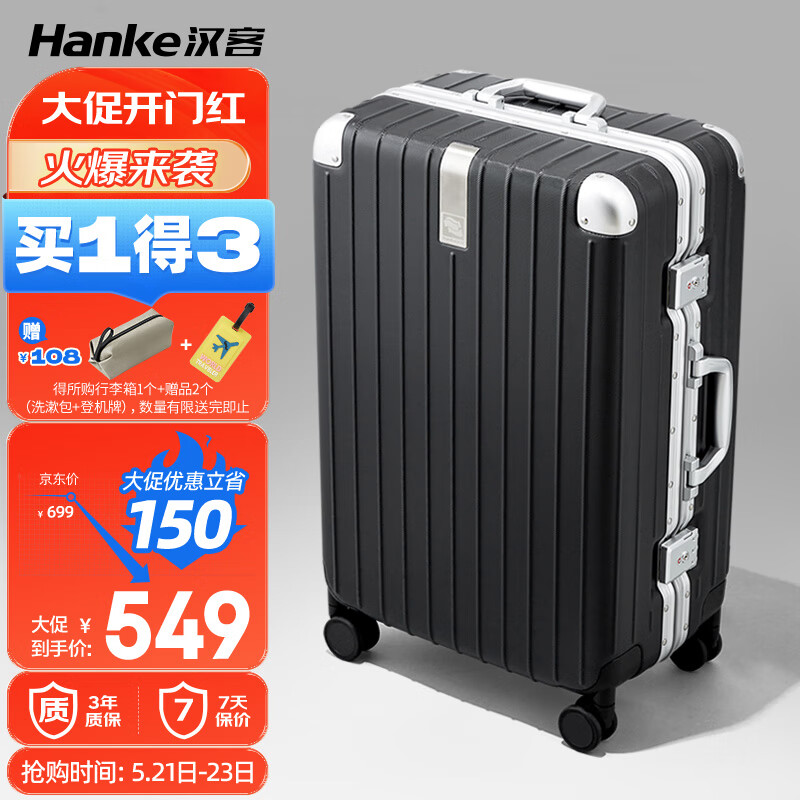 汉客行李箱铝框箱男拉杆箱女旅行箱大容量24英寸墨玉黑密码箱防爆耐摔价格:699.00元!
