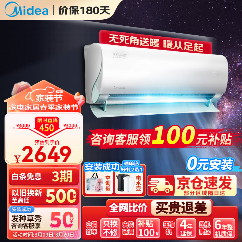 美的(Midea)大1.5匹极酷 省电 星新升级二代一级能效变频冷暖自清洁家用卧室壁挂式空调挂机KFR-35GW/N8VHA1Ⅱ价格:2649.00元!