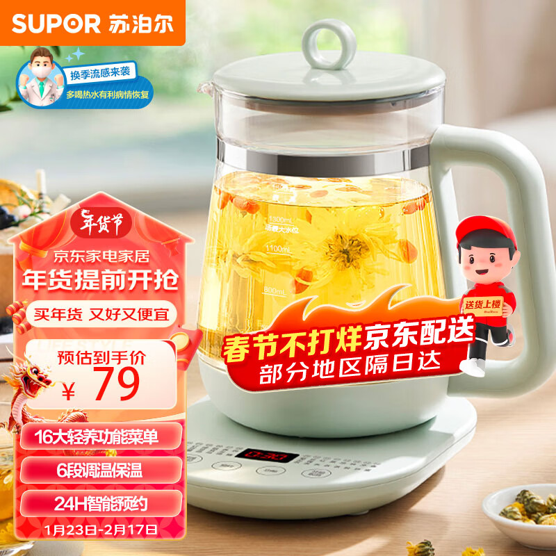 苏泊尔(SUPOR)养生壶 1.5L煮茶器花茶壶 电水壶烧水壶电热水壶开水壶 保温智能预约煮茶壶玻璃电茶壶 SW-15YP20价格:79.00元!