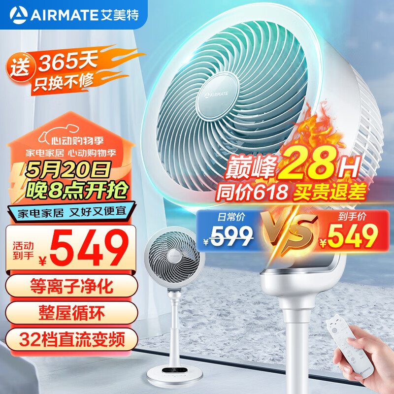 艾美特(AIRMATE)“白天鹅升级款”空气循环扇等离子净化32档直流变频家用落地扇3D自动摇头台立式轻音电风扇 RDI82价格:599.00元!