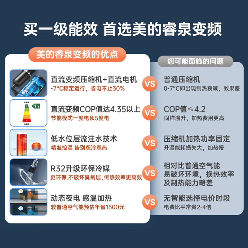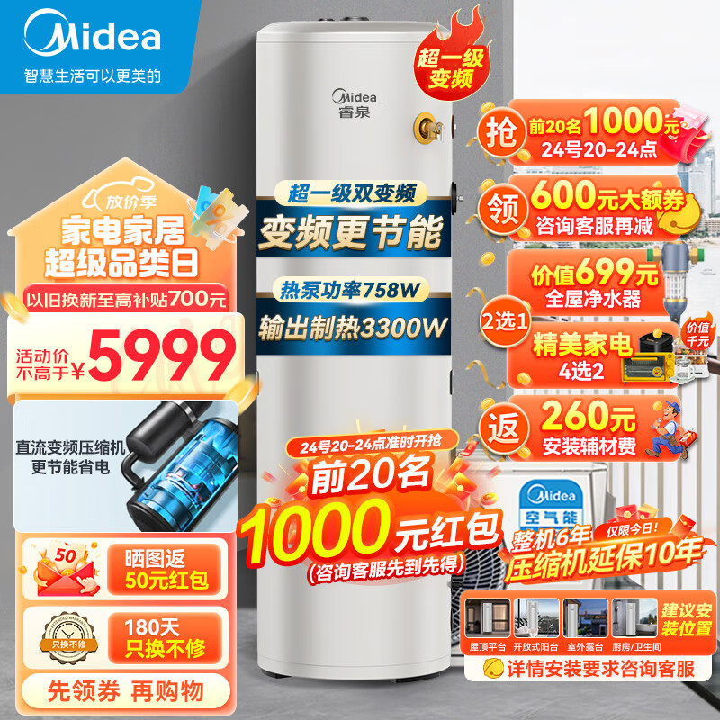 美的(Midea)空气能热水器家用200升包安装一级能效变频节能动态夜电R32冷媒热泵睿泉RSJF-V33/RN8-X1-200-(E1)价格:6099.00元!