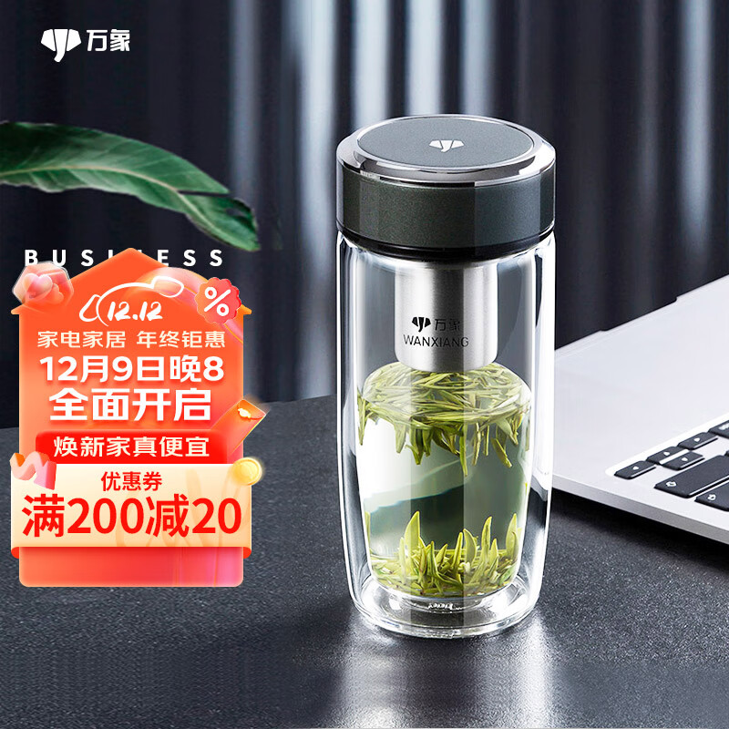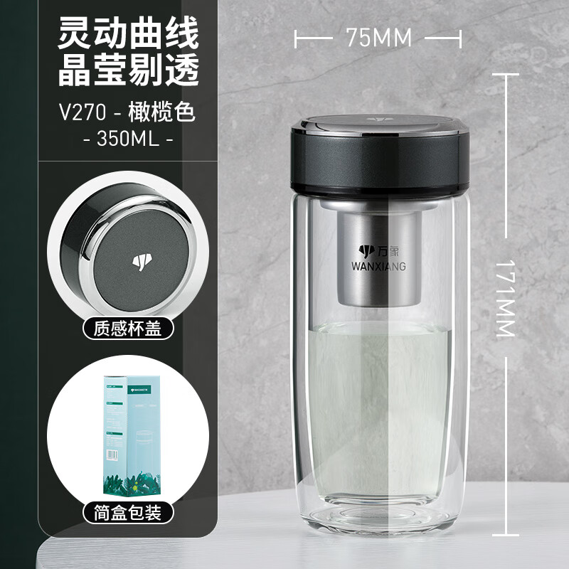 万象(WANXIANG)双层弧形玻璃杯男女士带滤网水杯橄榄色350ml便携车载泡茶杯价格:171.00元!