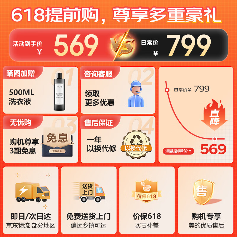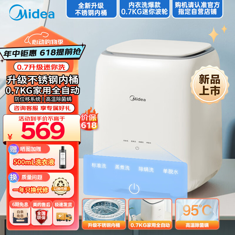 美的(Midea)0.7公斤内衣洗衣机家用内衣裤迷你洗衣机高温除菌洗袜子神器全自动洗脱一体机不锈钢内桶MNB7VH1E价格:569.00元!