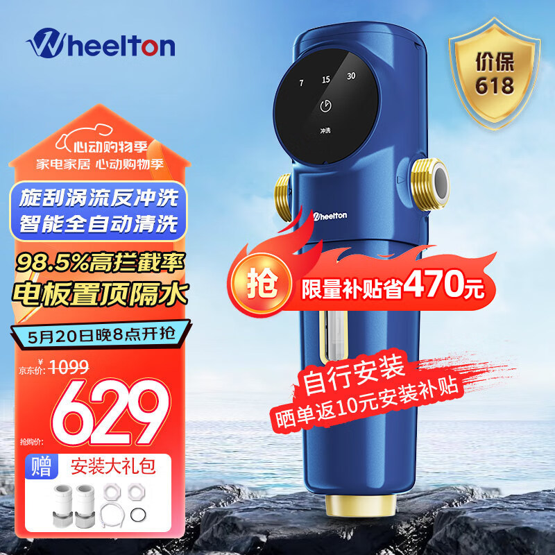 惠尔顿(WHEELTON) 前置过滤器全自动清洗全屋净水器家用反冲洗自来水过滤器P0063 智能自动旋刮清洗 智能自动反冲价格:629.00元!