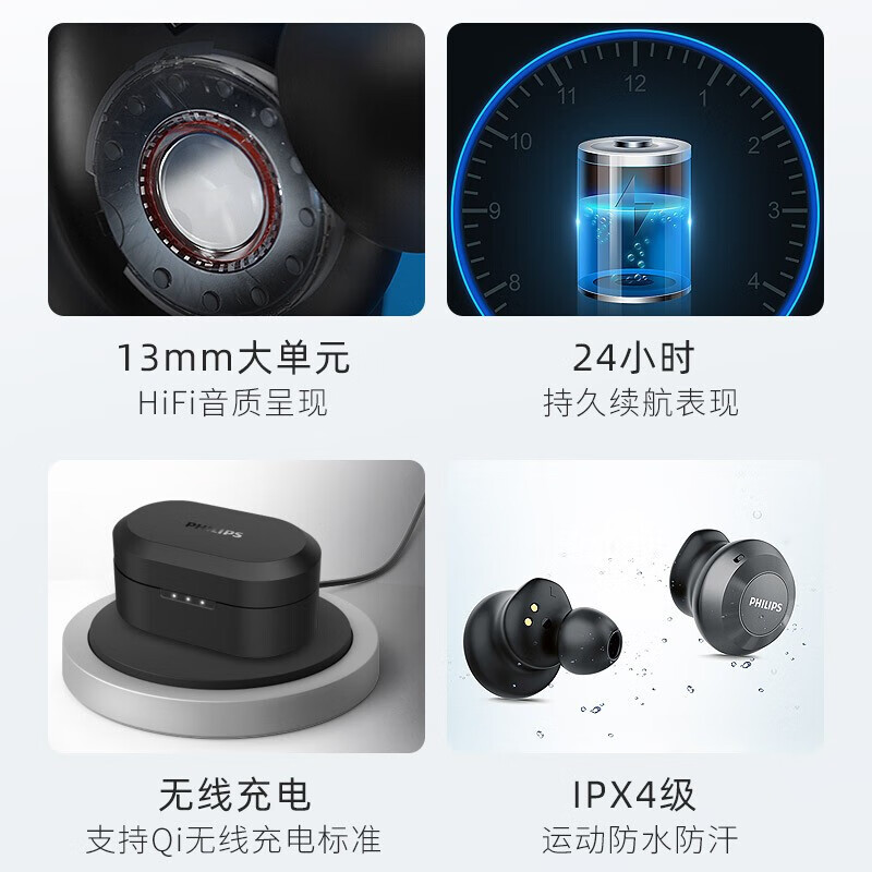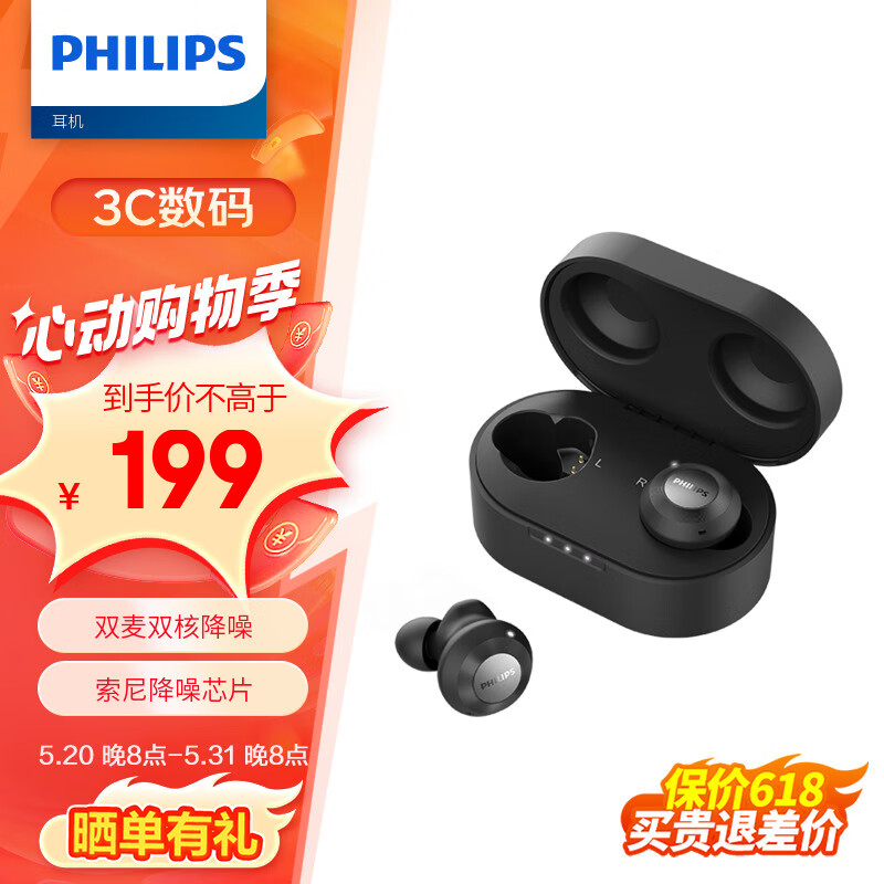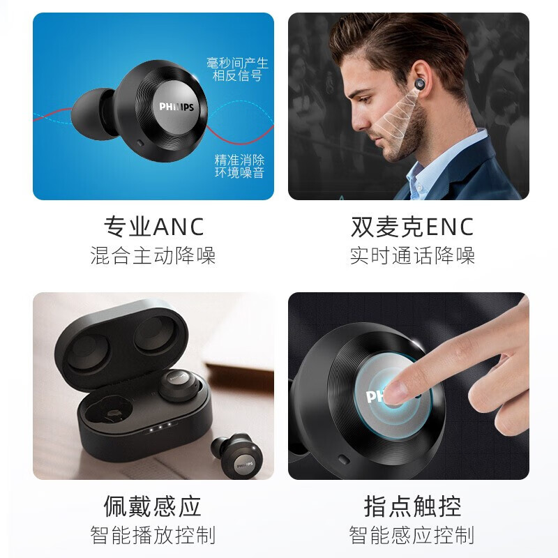飞利浦(PHILIPS)真无线蓝牙耳机无线耳机主动降噪双芯双馈苹果华为小米TAT8505黑价格:199.00元!