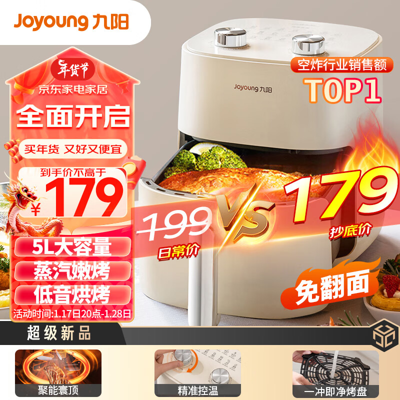 九阳(Joyoung)不用翻面 聚能寰顶 高效烘烤 蒸汽嫩炸空气炸锅 家用5L大容量 薯条机电炸锅 KL50-V515价格:179.00元!