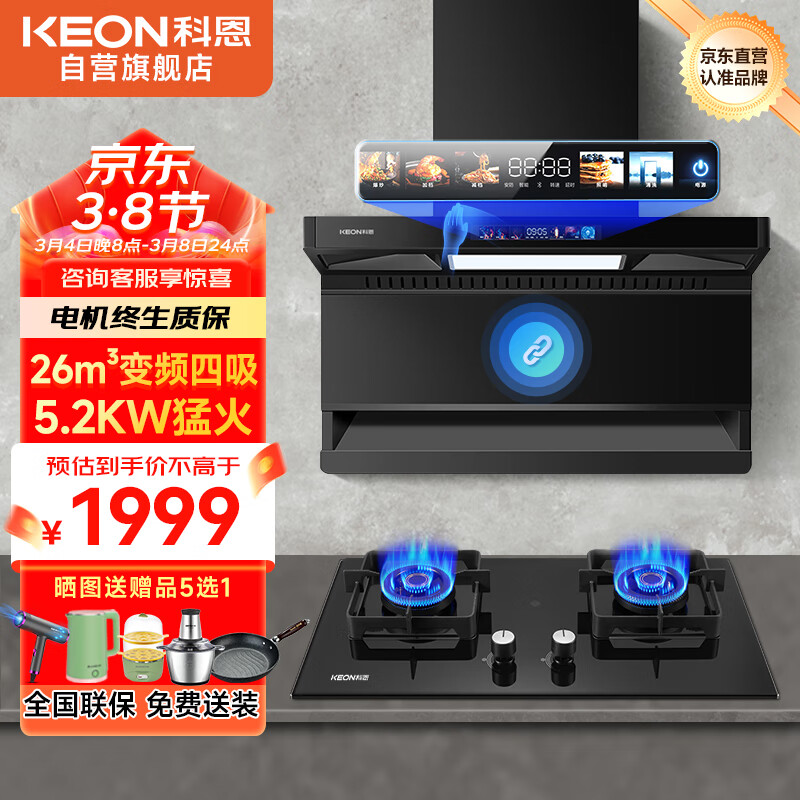 科恩(KEON)家用烟灶套装26m3变频三腔四吸大吸力抽油烟机5.2kw猛火燃气灶具两件套PY3-BL+JX2-L价格:2349.00元!
