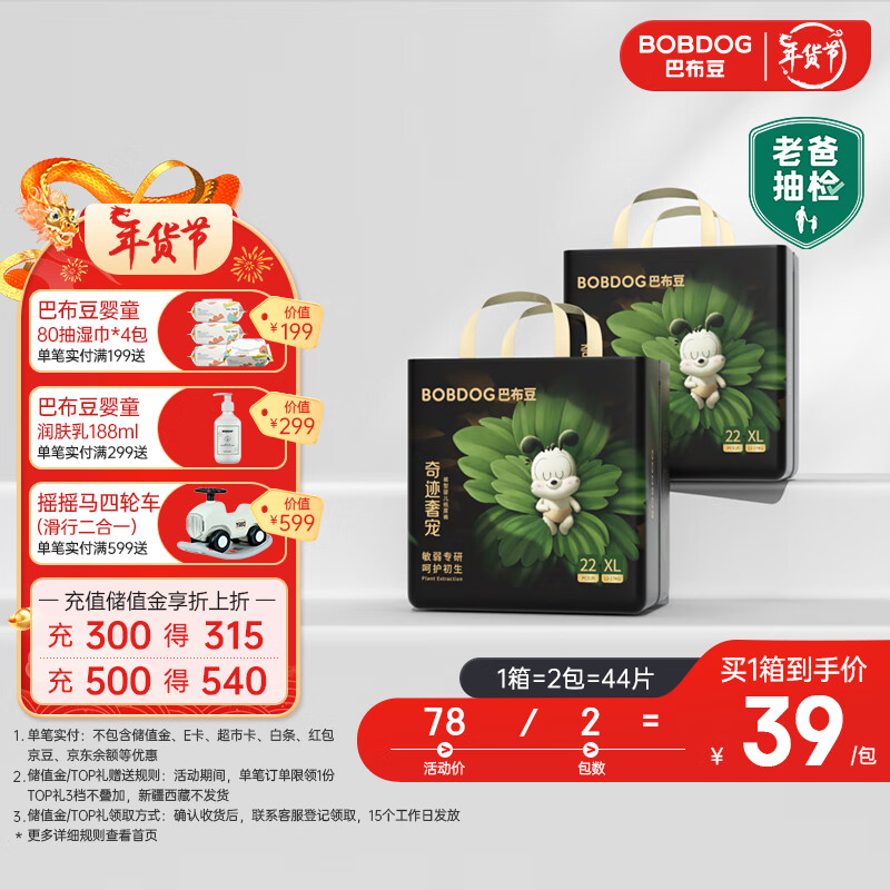 巴布豆(BOBDOG)【老爸】奇迹奢宠婴儿拉拉裤XL码44片(12-17kg)植萃舒敏价格:78.00元!